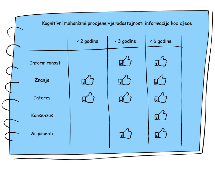 Kao dokaz tvrdnji o urođenoj sposobnosti prepoznavanja vjerodostojnosti informacija, autor citira znanstvene radove koji prikazuju ranu sposobnost djece za selektivno povjerenje prema nekoliko kriterija. Najprije, djeca u najranijoj dobi mogu prepoznati kompetentnost izvora. Odnosno, djeca već i prije druge godine života intuitivno prepoznaju da li odrasla osoba koja im se obraća poznaje temu o kojoj govori. Isto tako, u toj dobi su sposobna prepoznati interes sugovornika, radi li se o zajedničkom interesu ili odrasli informant nameće temu i informaciju zbog svojih razloga. Već u trećoj godini života djeca mogu pratiti i iskustveno povezivati ranije izjave istog izvora i procijeniti njegovu vjerodostojnost reputaciju. Nešto kasnije, u predškolskoj dobi, djeca su sposobna staviti novu informaciju u kontekst općeg znanja i prepoznati je li nova informacija usklađena sa šire prisutnim stavovima u okruženju ili je potpuno neočekivana i odskače od općeg uvjerenja.