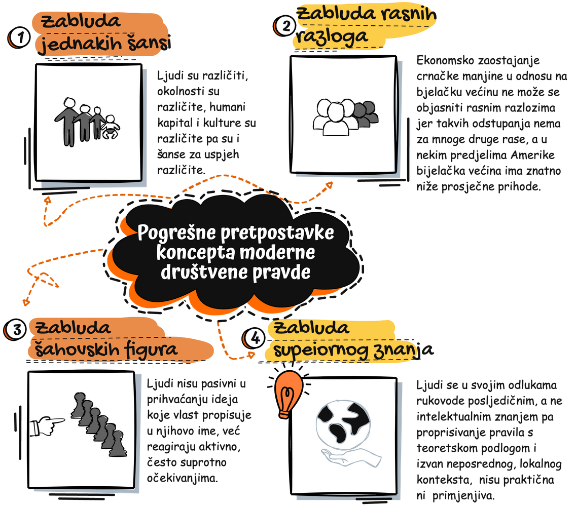 Najprije, ideja socijalne pravde se od pedesetih godina prošlog stoljeća naovamo dramatično promijenila. Od ideje jednakih uvjeta, transformirala se u ideju jednake zastupljenosti. Drugim riječima, današnja socijalna pravda očekuje ravnopravnu zastupljenost svih društvenih kategorija u svim društvenim aktivnostima. Ovo očekivanje je, tvrdi i dokazuje autor, potpuno neprirodno i praktički neizvedivo. Ovakva formulacija društvene pravde je utemeljena na zabludi jednakih šansi.
