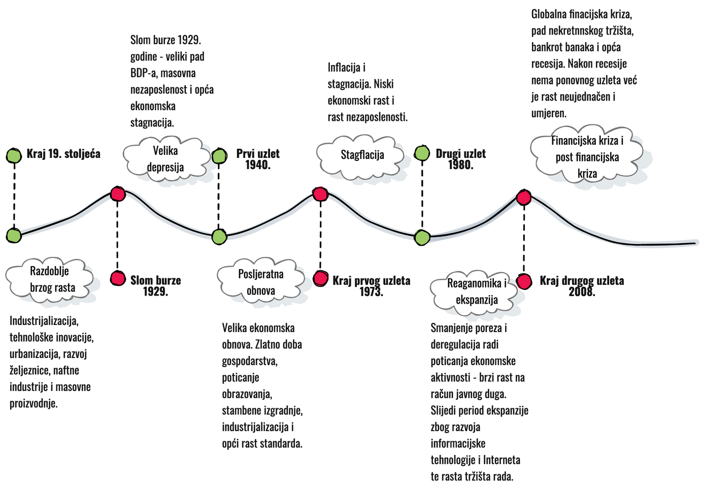 U posljednjih stotinu i pedeset godina američka ekonomija prolazila je nekoliko uspona i svako od tih razdoblja je karakterizirala snažna razvojna aktivnost i primjena novih tehnologija koje su mijenjale društvo.