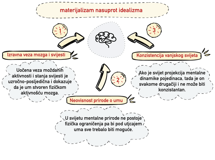 Na tom intelektualnom putu najprije treba prihvatiti ideju da materijalizam – teorija koja u temelju prirode vidi materijalne komponente, odnosno elementarne čestice, nije rezultat neposrednog iskustva pa njene postavke ne možemo smatrati činjenicama. Ova se tvrdnja može smatrati radikalnom, ali ona to nije. Naime, svako opažanje u prirodi prolazi filter svijesti i ne može se smatrati ravnopravnom osobnom (first person) doživljaju.