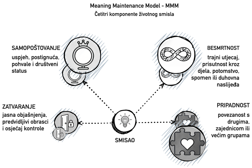 Važan problem materijalističke ontologije je nedostatak intuitivnog osjećaja smisla. U socijalnoj psihologiji (Meaning Maintenance Model – MMM) postoje četiri izvora smisla, a to su: samopoštovanje, osjećaj kontrole koji proizlazi iz prepoznate pravilnosti ili predvidivosti, pripadnost zajednici i osjećaj povezanosti te simbolička besmrtnost – vjerovanje u trajnu vrijednost vlastitog života.