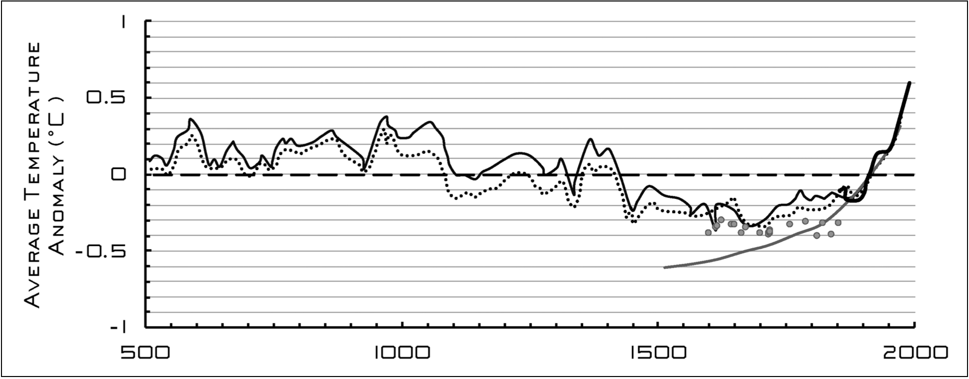 Prikaz globalnog odstupanja od očekivanih vrijednosti temperature tijekom posljednjih tisuću i pet stotina godina. Podaci su rekonstruirani različitim metodama procjene kao i izmjerenim vrijednostima korištenjem modernih instrumenata. Na grafu je prikazano odstupanje u odnosu na prosječnu izmjerenu vrijednost u razdoblju od 1881. do 1980. godine i vidi se rast odstupanja nakon 1950. godine.*