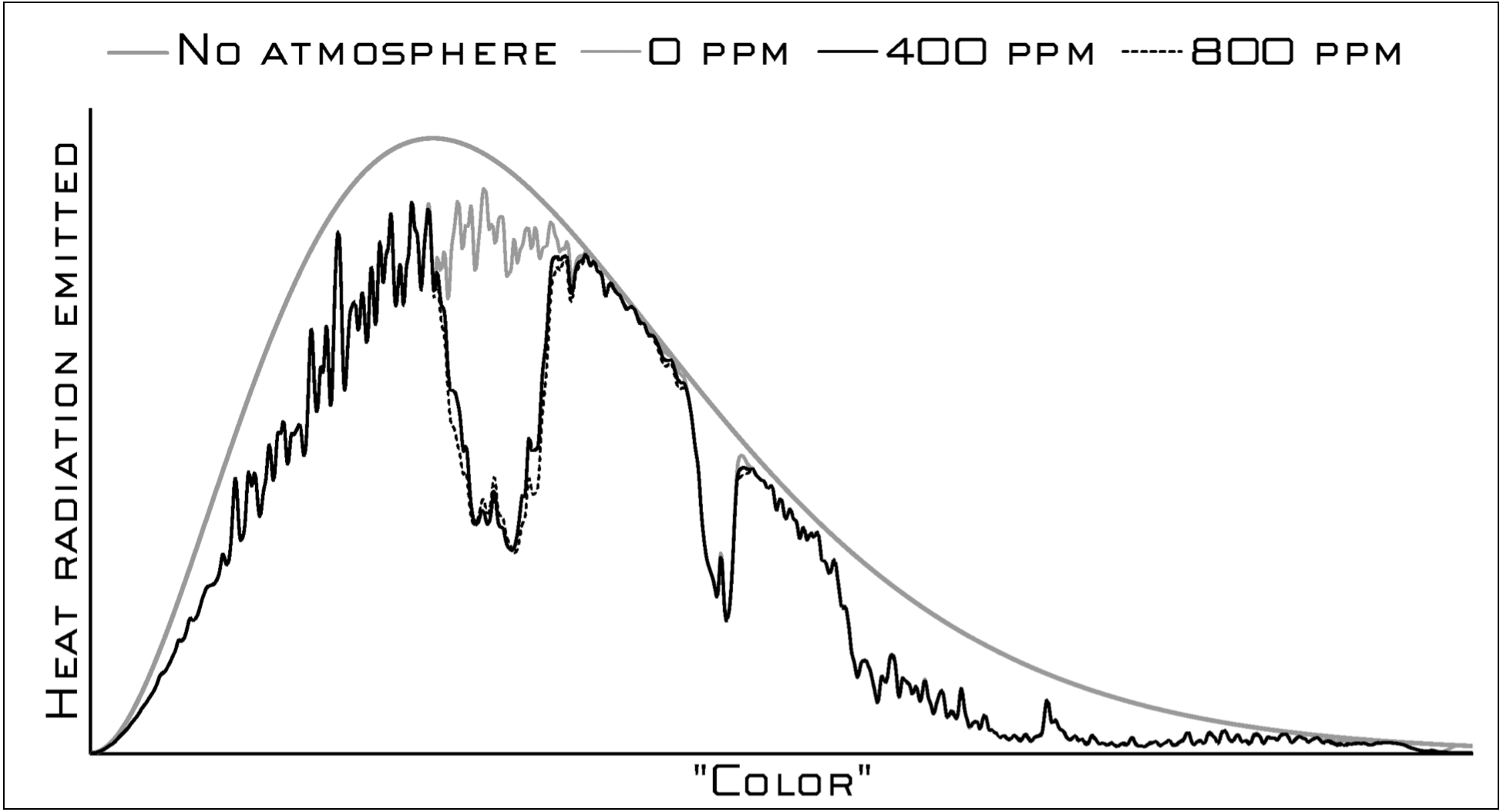 2 3 temperaturni spektar Co2Slika objašnjava fenomen snažnog utjecaja karbon dioksida na zadržavanje topline u atmosferi. Naime, karbon dioksid djeluje reflektirajuće na frekvenciji (boji) najintenzivnijeg toplinskog zračenja – tako da se ono zadržava u atmosferi, umjesto da se propušta u svemirsko prostranstvo.*